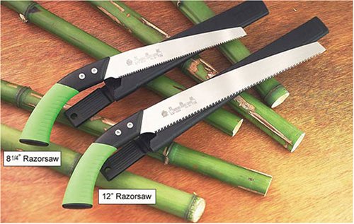 Bamboo Razor Saws are specifically designed for pruning and harvesting bamboo without tearing the outer fibers of the stock. The blades are electro-chrome plated to reduce tarnish and give a smooth clean cut. The teeth are impulse hardened for an extended life of razor sharp cuts. A blade can easily be replaced if damaged. The large saw is suitable for bamboo 1 to 6 in diameter. The smaller bamboo saw will handle stocks up to 3 in diameter. They come in a rigid plastic case with belt loop. Blade length is 8" blade and Overall length is 15" with 16 teeth per inch.